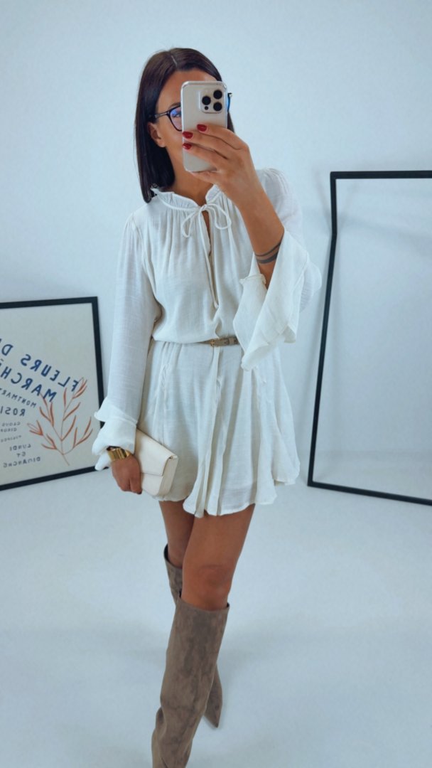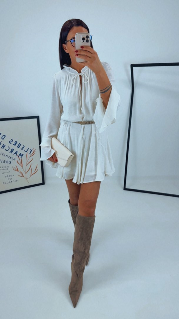 Krémové volánové šaty volného střihu.