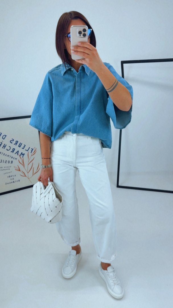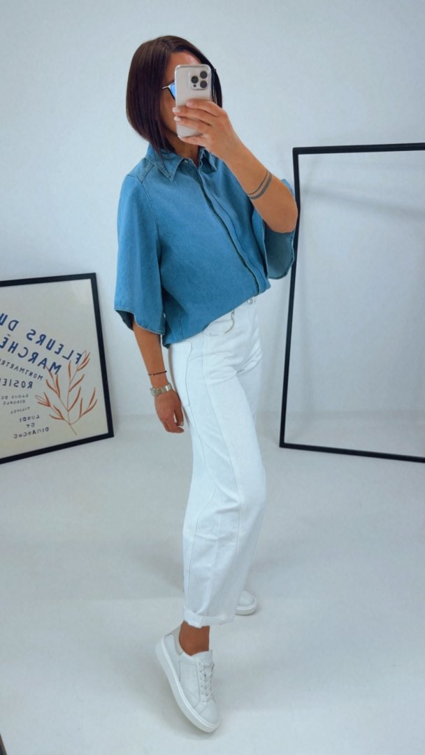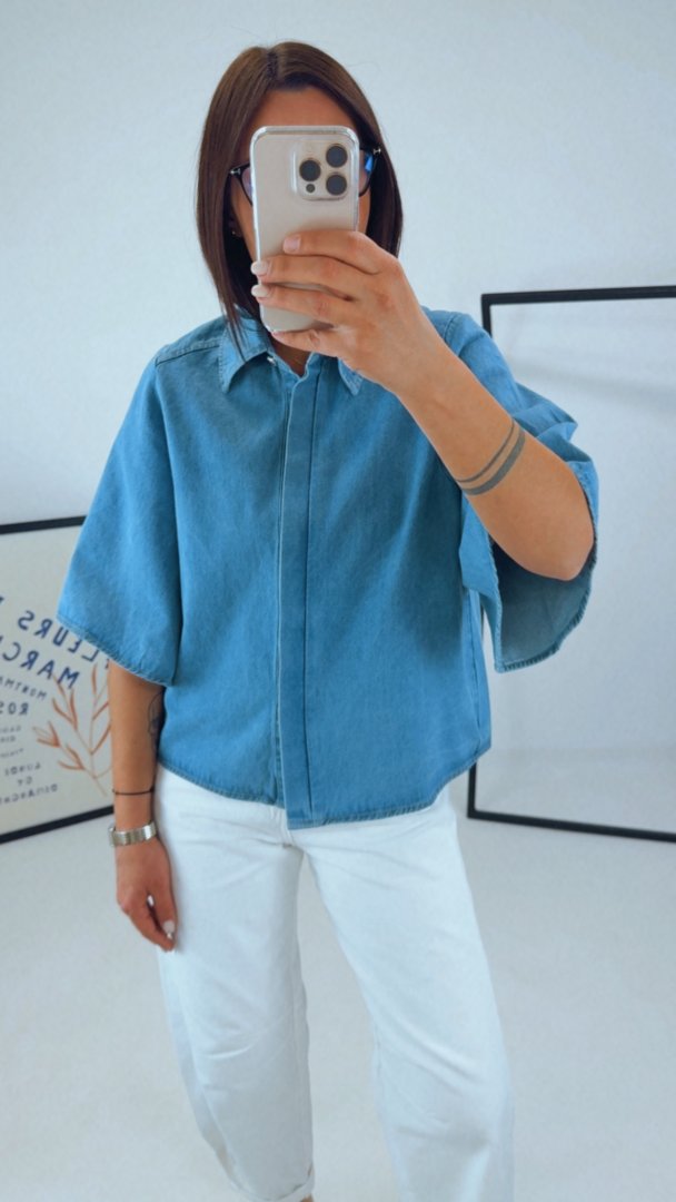 Denimová košile volného áčkového střihu s 3/4 rozšířeným rukávem