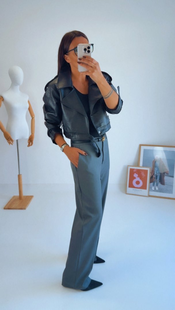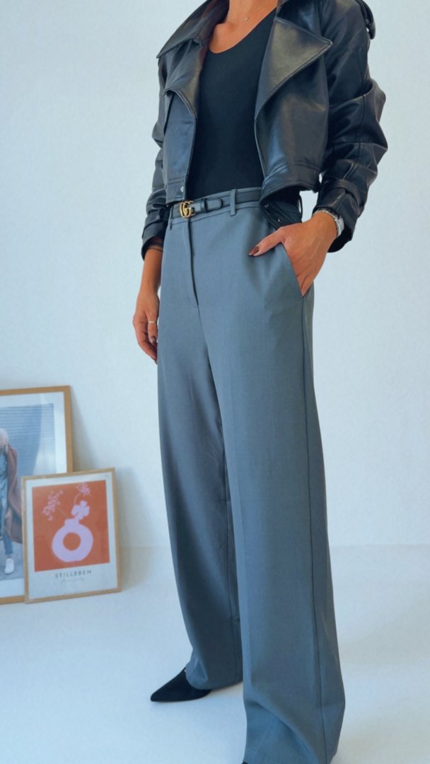 - Šedé kalhoty s vysokým pasem