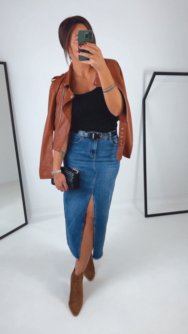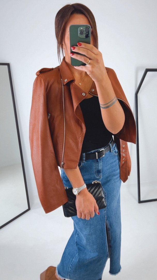 - Kratší koženková bunda v barvě camel
