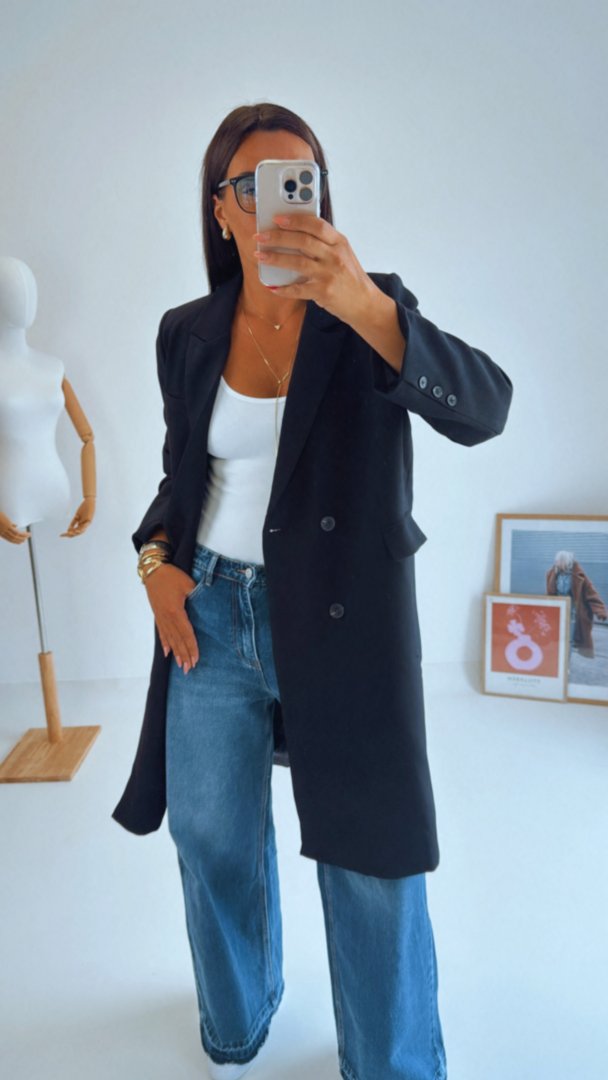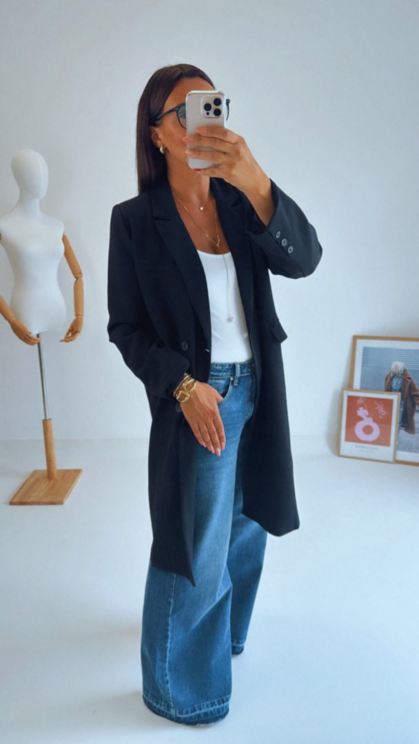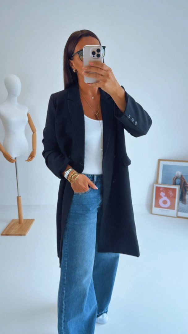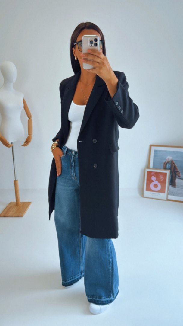 - Černý podzimní kábát sakového střihu s kapsami na stranách